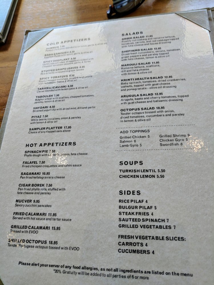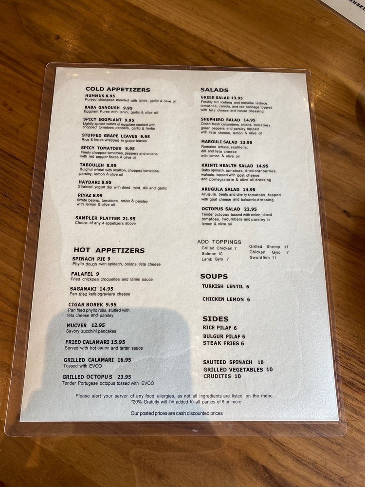 Introducing the menu at Krinti Mediterranean Grill, located in Woodbury, NY. Enjoy a variety of Mediterranean delights with options for vegetarians and an extensive menu featuring cold appetizers like the creamy Hummus and hot appetizers like the flavorful zucchini pancakes and crispy Fried Calamari. Indulge in the heartwarming Turkish Lentil Soup or the Chicken Lemon dish. Customers rave about the outstanding food quality and attentive service, making it a must-visit spot for Mediterranean cuisine lovers. With ample parking, indoor and outdoor dining options, and a modern casual vibe, Krinti Mediterranean Grill offers a delightful dining experience. Don't miss the must-try items like the Greek Salad with chicken gyro, crispy calamari, and flavorful lamb kabob. Experience the best of Mediterranean flavors at Krinti Mediterranean Grill.